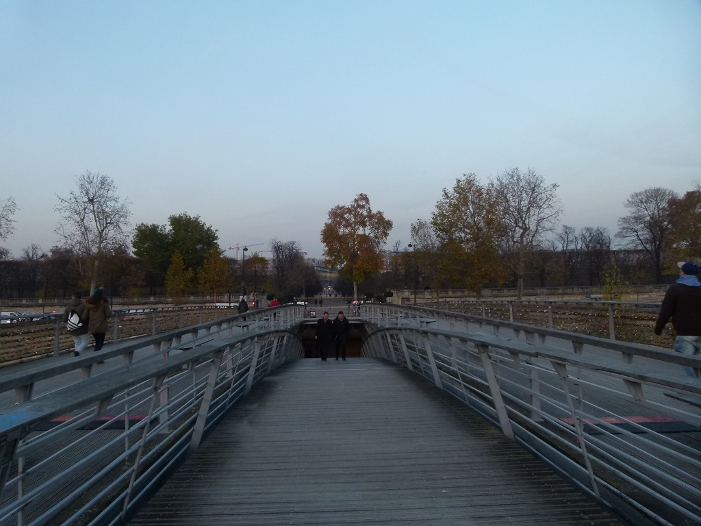התחנה היתה סמוכה לגשר שנראה מקסים – גשר להולכי רגל בלבד. גשר כזה נקרא בצרפתית Passerelle . ברשימת המכולת שלי הופיע גשר סימון דה-בובואר שגם הוא, ע"פ תמונות, גשר דומה מאד לזה (נדמה לי שעליו כן נוסעות מכוניות, במפלס תחתון). שניהם גשרים חדשים יחסית בפריז. לגשר "שלנו" שני מפלסים והוא עשוי כדק.